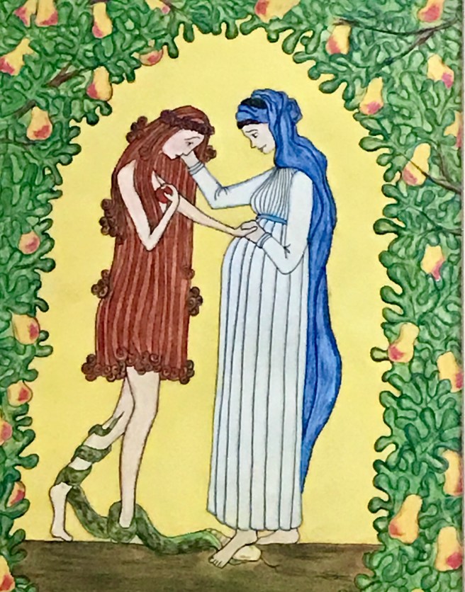This image hangs in my kitchen, a gift given to me by my dear sister. It is a picture of the childless Eve, wrapped in the snare of the serpent, and her counterpart, Mary, full of promise and hope for the gaping wound in humanity. Most prominent to me is the connection they share; an ancient sisterhood binding them together. Both capable of bringing forth life while wrestling with the consequence of their opposing choices. A fitting portrayal of the times in which we live.